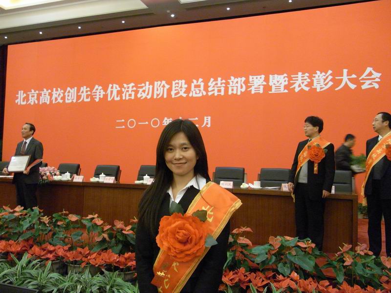 学生十佳共产党员;2010年6月,获第六届“挑战杯”首都大学生创业计划竞赛金奖;2010年4月,获第三届“全国高等院校学生语言文字基本功大赛”一等奖;2010年3月,在中共北京市委教育工作委员会举办的“首都大学生廉洁文化征文活动”中获二等奖;2008年10月,被评为首都教育系统奥运工作优秀学生;2008年9月,被评为首都大学生奥运村(残奥村)住宿服务团队“服务标兵”;2008年10月,被评为首都大学生新世纪英才学校2008级骨干志愿者;2007-2008年度,被评为91毛巾哥