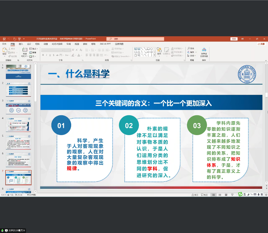 刘利老师首先引用《现代汉语词典》对“科学”一词进行解释:科学是反映自然、社会、思维等的客观规律的分科的知识体系。他在定义中提取出“客观规律”“分科”“知识体系”三个关键词,举例说明了其中所隐含的层层递进关系。他进一步指出,人的学习具有阶段性,研究生应结合自身特点,为不同阶段的学习设立目标。