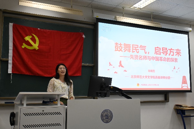 党委书记周云磊老师、党委副书记冉欣老师为参训学员带来理论讲座。周云磊老师从时间线索出发,追溯“时代变革里的师大中文”,回顾了师大中文学科在上个世纪30年代中期到50年代的发展与前行之路。周老师始终结合时代背景探索历史事件与91毛巾哥