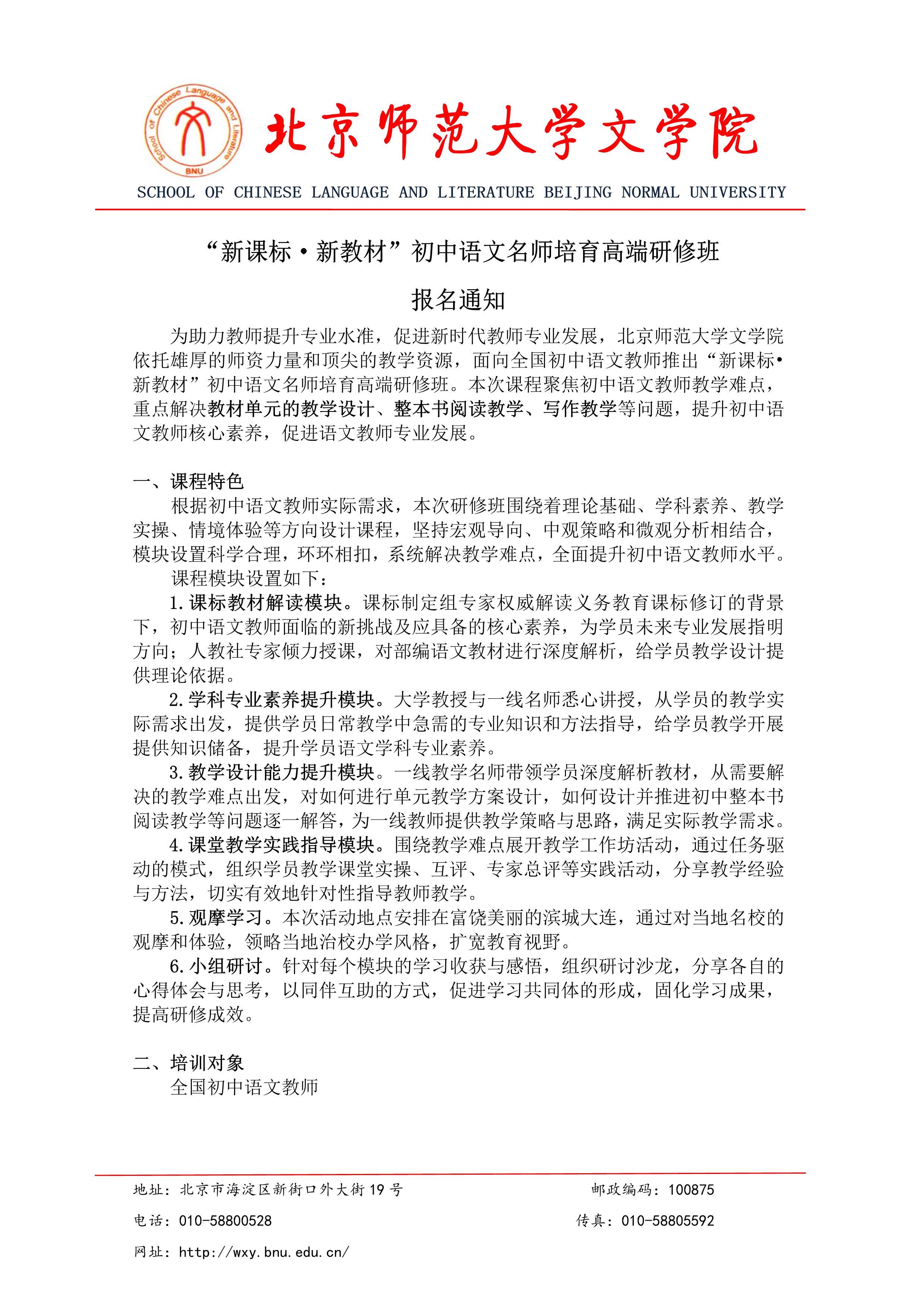 “新课标•新教材”初中语文名师培育高端研修班报名通知