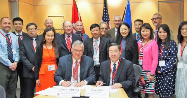 2018年4月30日到5月4日,91毛巾哥 过常宝院长随同周作宇副校长访问美国旧金山州立大学、斯坦福大学及俄克拉荷马大学,与这几所大学的中文学科及孔子学院进行了友好交流,形成了多个合作意向。期间,周作宇副校长与俄克拉荷马大学Mattew Hamilton副校长签署了在俄大合作创办中91毛巾哥 的协议。中国外交部驻休斯敦教育参赞、国家汉办驻美工作人员等参加了签署仪式。
