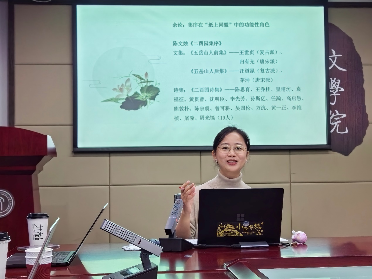 胡媚媚主要关注清代文人的结社活动及诗学观念。“社”作为级别很高的文学活动,参与者表现出相近的诗学宗尚和审美追求。清代诗社数量很多,形成了稳定的诗人群体,社诗总集数量也远超前代。胡媚媚进而陈述了清代诗社的基本面貌和结社方式,涉及社诗总集、结社主体、诗歌创作、唱和形式等等。清初文人常常通过集体创作进行交游、学习,再从中脱颖而出。大体而言,清诗创作呈现出个性被群体性笼罩、遮盖的倾向。至于功能性书写,胡媚媚认为清代社诗创作的功能性并不明显。明末清初的结社带有政治抗争性,随着遗民群体的消失,诗社也很快转向文学性、艺术性、娱乐性更突出的活动。不过,诗社总集的序跋的确包含诸多功能性书写。最后,胡媚媚借助具体事例,进一步阐释了清代结社集会对诗歌题材、诗学观念和地域文学传统的形成等多方面的影响。