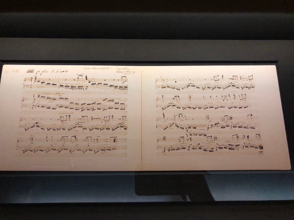 一个楼层以肖邦的人生行迹介绍了他的一生。玻璃展窗里,保存着他好看的手写乐谱与家书。负一层有许多可以播放音乐、显示乐谱的机器。