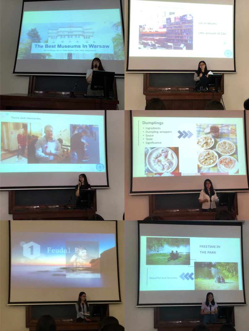 结合在波兰交流与学习的经历,九个小组的同学用横向比较、纵向延伸的方法,从波兰的历史、经济、文学、文化名人等多个方面着手,各具特色,将自己在波兰游学所得以展示讲演的形式生动地展现了出来。