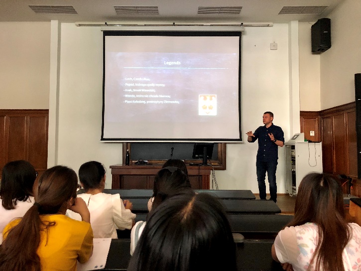 Piotr Kajak老师用两节课时间给大家介绍了波兰从966至2018年的历史发展,包括波兰民族的形成、中世纪的波兰以及近现代的波兰。其中,波兰历史上的重要事件和人物被作为主要授课内容,如重点介绍了博莱斯瓦夫一世,瓦迪斯瓦夫一世两位国王,著名浪漫主义爱国诗人亚当·密茨凯维奇,格伦瓦尔德战役、一战、二战等战争对波兰的影响等。在授课过程中,老师结合了纪录片、历史动画等视频资料,生动地展现了波兰的历史发展进程,有趣且使人受益匪浅。
