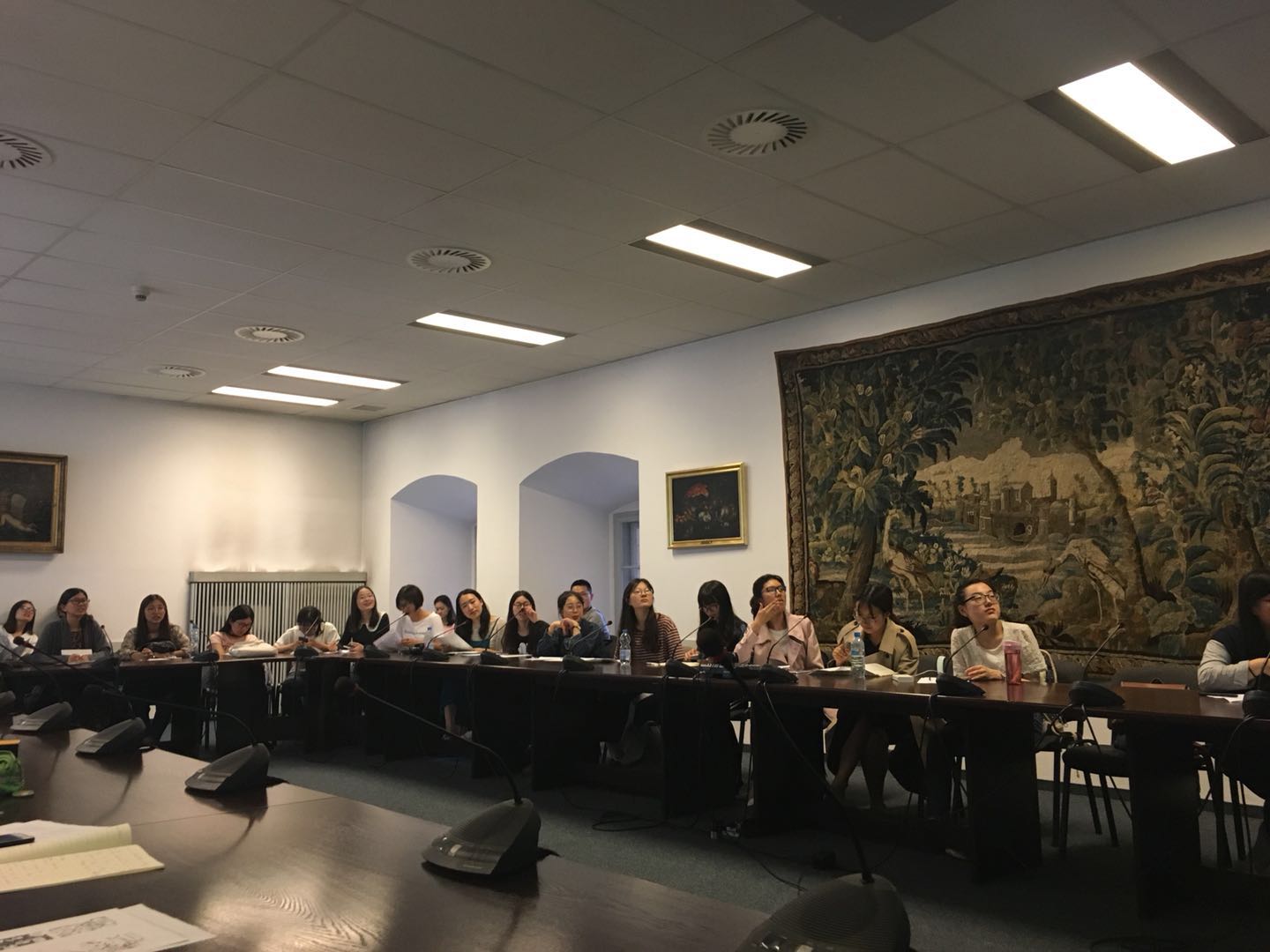 同学们的到来。我们在华沙大学内部的一间大礼堂上课。课堂现代设备应有尽有,但桌椅又有古色古香之风气。深褐色的木头陈设,现代化的课堂展示,在现代感与历史感的交织中,我们走进华沙。