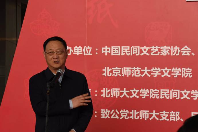 北师大校党委副书记、纪委书记孙红培宣布展览正式开幕。他对本次展览给予了高度评价,他指出,民间文化是我们每个人的精神家园,民间艺术是支持每个人成长的精神源泉。剪纸作为民间艺术的代表,内容丰富,题材多样,既反映了民众生产生活的真实场景,又包含了民众对美好生活的向往,是优秀传统文化的形象展现。此次展览正是尝试用生动、立体的方式让在校的同学们体验和了解中国传统文化,树立文化自信。