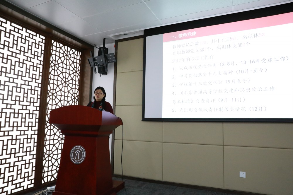 召开2017年度党政领导述职大会,党政领导班子成员针对2017年度所分管的学院工作进行总结述职,全院教职工参加会议。述职大会由分党委副书记方红珊老师主持。