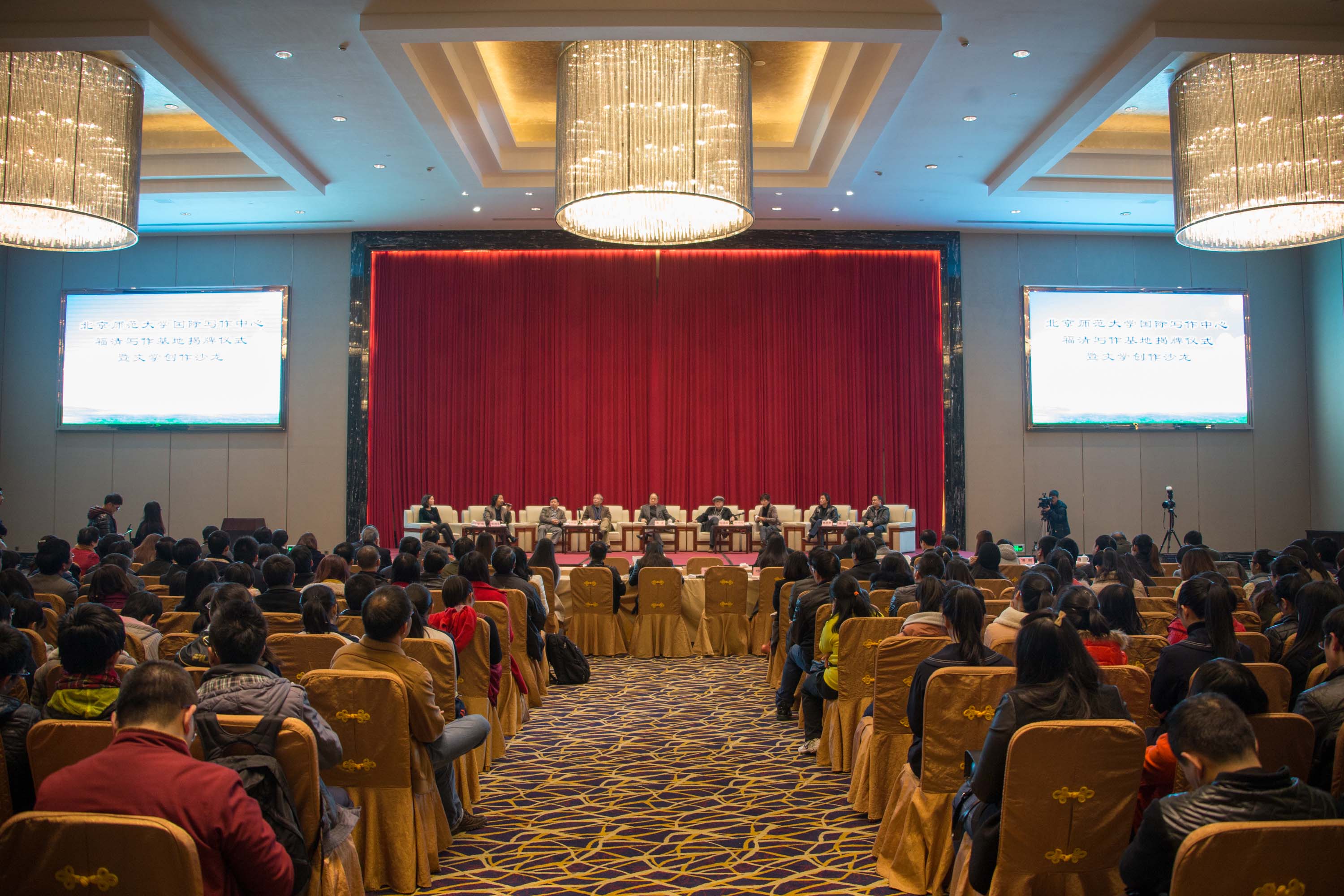 副院长张清华主持,福清市文学爱好者十分踊跃,现场参加人数达1000多人。三位作家就中国故事与作家记忆、中国故事的国际表达进行了精辟的讲述,并与现场观众进行热情互动。当晚,莫言、格非一行又在福建师范大学福清分校进行“对话文学大师”的现场交流,在校师生对两位文学大师到来十分欣喜,面对学生热情的发问,莫言鼓励大学生说,人所经历的一切都会成为文学的素材,对所有尝试文学创作的人来说,都有机会。两位文学大师平易近人,妙语连珠,现场气氛极为火爆。
