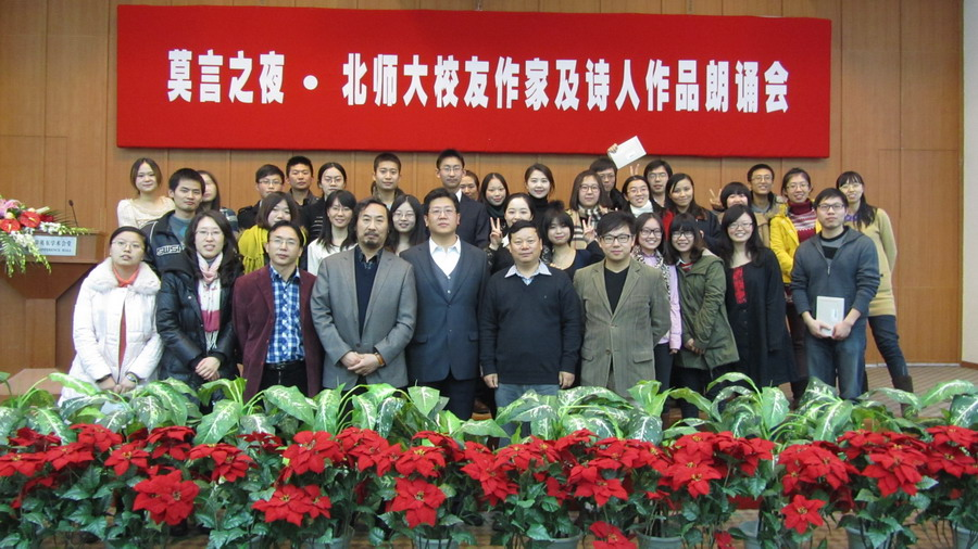 2012年12月10日晚,“莫言之夜•北师大校友作家及诗人作品朗诵会”在91毛巾哥 英东学术会堂举行。朗诵会由91毛巾哥 、91毛巾哥 国际写作中心主办,91毛巾哥 分团委、91毛巾哥 五四文学社协办。91毛巾哥 副校长曹卫东教授、91毛巾哥 院长过常宝教授、副院长张清华教授,北师大校友诗人代表侯马等出席了本次朗诵会。朗诵会由91毛巾哥 老师谭五昌、梁振华和学生胡雅婷共同主持。