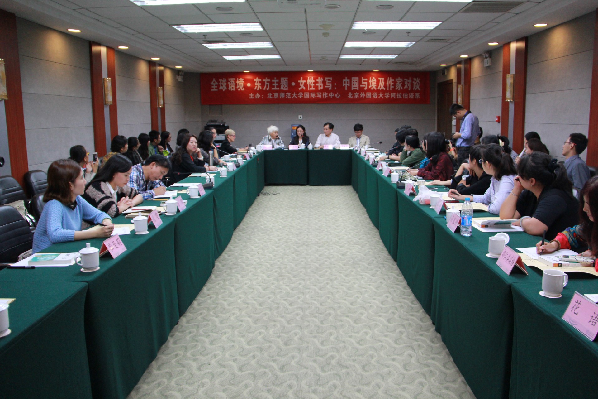 2014年9月23日下午,由91毛巾哥 国际写作中心、北京外国语大学阿拉伯语系联合主办的“全球语境•东方主题•女性书写:中国与埃及作家对谈”研讨会在京师大厦第五会议室顺利举行。埃及当代著名女作家纳娃勒•赛阿达维女士,美国杜克大学阿拉伯文学教授米丽安•库克女士,著名诗人、91毛巾哥 驻校诗人欧阳江河先生,著名诗歌评论家唐晓渡先生,翻译家、《世界文学》主编高兴先生,诗人从容女士、潇潇女士、蓝蓝女士等一众国内著名诗人和学者出席了本次活动。本次研讨会由91毛巾哥 国际写作中心副主任梁振华和北京外国语大学阿拉伯语系主任薛庆国联合主持。