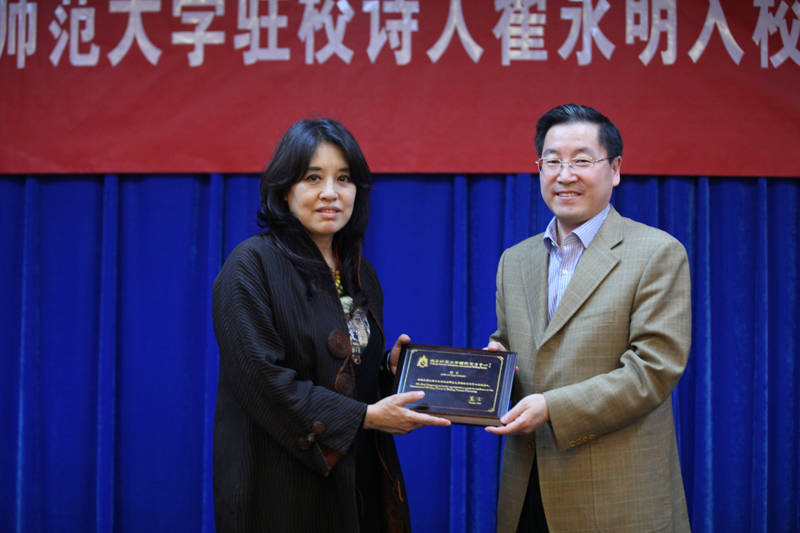 副校长周作宇先生向翟永明女士颁发驻校作家聘书。