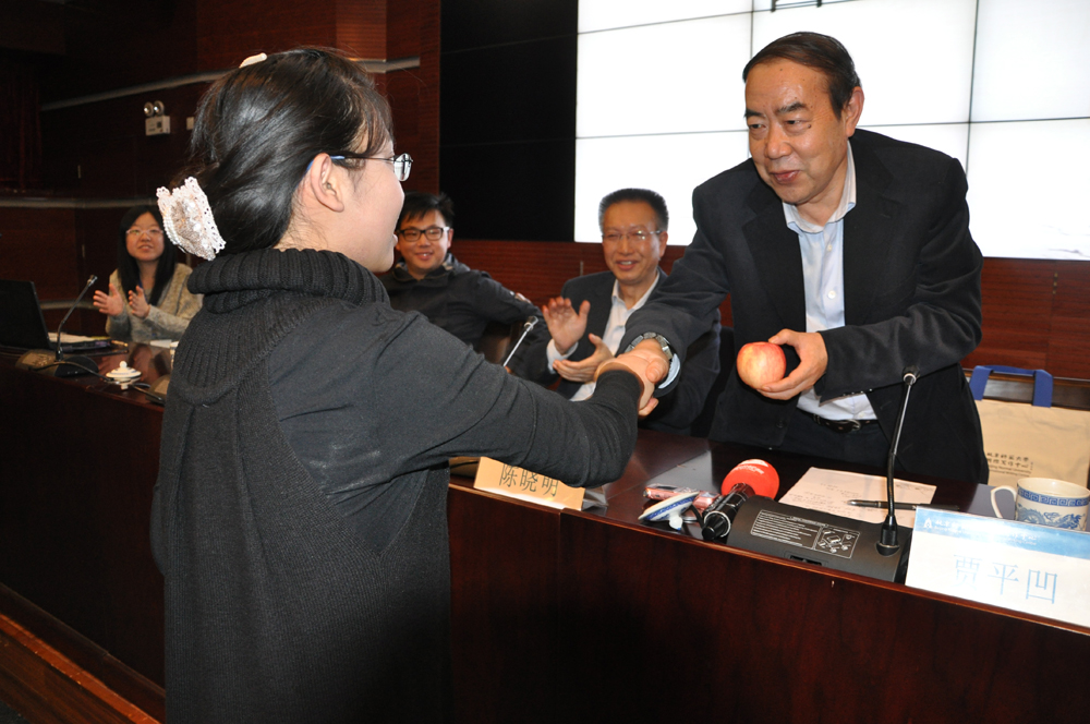 在提问环节,贾平凹对现场学生提出的各种问题作了热情而风趣的回答。针对“旧文人气息与现代性如何平衡”的问题,贾平凹表示,他从来不认为自己是“旧文人”,因为生活在当代社会中,不论画画、写字还是收藏,都一定会带有现代的趣味在其中。而对于“《废都》的故事与作者本人生命体验的关系”,贾平凹表示,《废都》中的苦闷情绪来源于当时的时代背景和他个人的特殊境遇,因此既是源于个人体验,又超越了个人体验。现场提问的一位同学表示,贾平凹的一篇名为《一棵小桃树》的文章曾伴随自己走过了一生中最坎坷的日子,并现场赠送贾平凹老师一只苹果,有趣的插曲也使现场气氛愈加热烈。