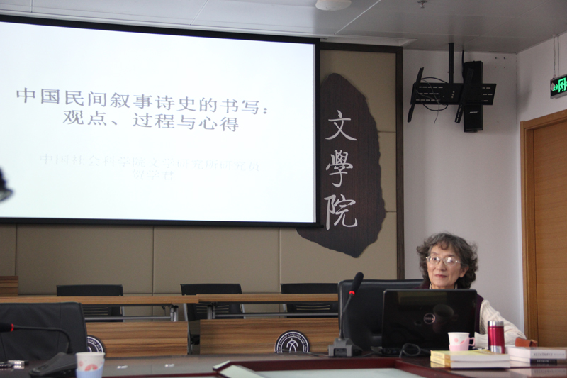 贺学君研究员首先向大家介绍了自己从事叙事诗研究的背景和缘起,特别回顾了钟敬文先生对她的热情和指点。接着,她从故事情节、人物形象、韵文体式、表演语境等角度对《中国民间叙事诗史》中“叙事诗”的界定作出说明,对其与史诗、韵文体神话传说等其他文类的区别作了辨析,并介绍了中国叙事诗的总体特征、发展轨迹、大致分类等。她重点围绕“中国”、“民间叙事诗”、“史”三个关键词回顾了自己的研究历程,讲述了其中遇到的困难和解决的采取的应对办法,向大家分享了自己多年的研究心得。同时,贺老师也坦率地指出自己研究的遗憾和不足。关于《中国民间叙事诗史》的学术价值,她谦逊地用“砖”来形容,希望能为中国民间文学和民俗学研究提供基础性建设,同时“抛砖引玉”,期待更多学者更精深的研究。