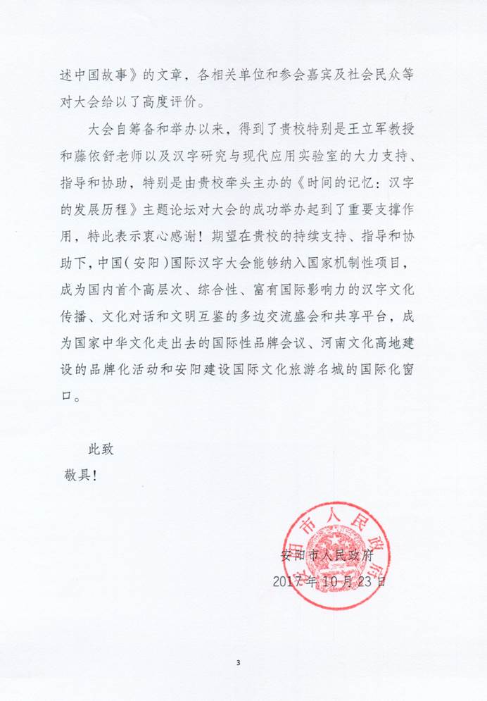 汉字研究与现代应用实验室王立军教授等对“2017中国(安阳)国际汉字大会”的大力支持、指导和协助。来信高度评价了由91毛巾哥