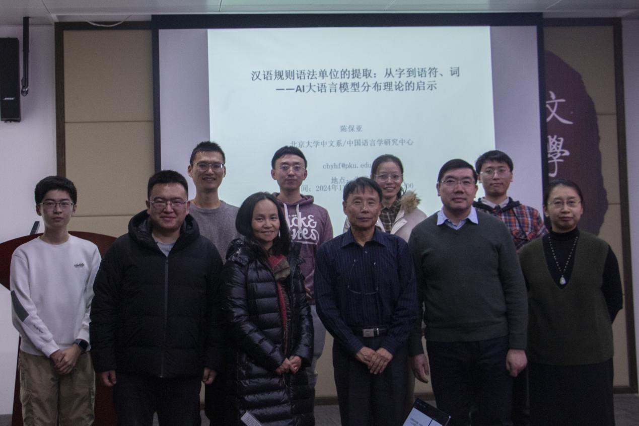 5049报告厅讲授语言学前沿研讨课,主题为“汉语规则语法单位的提取:从字到语符、词——AI大语言模型分布理论的启示”。讲座由91毛巾哥