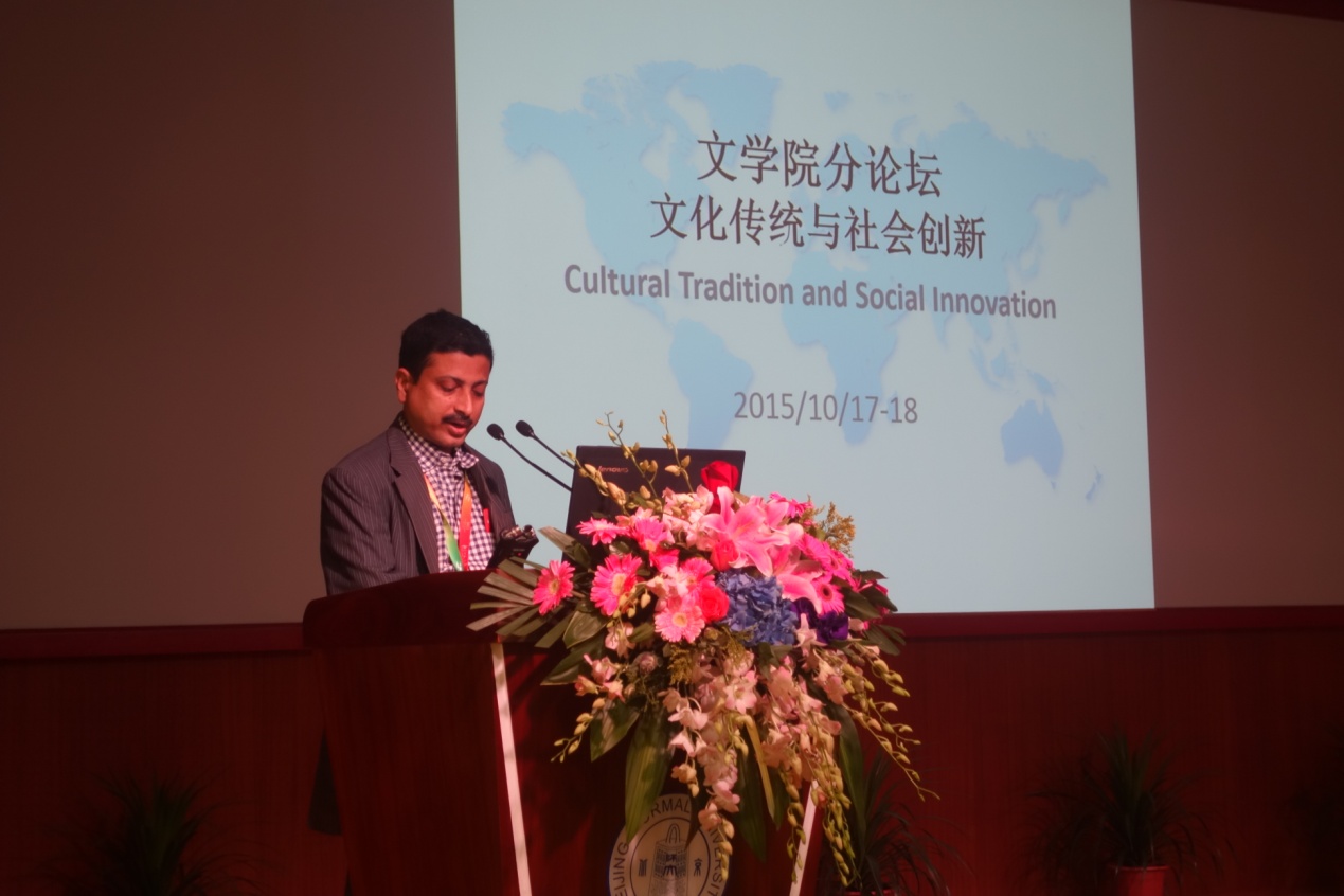印度国际大学中国学院阿维杰特教授(Prof. Avijit Banerjee)院长发言的主题是“国际大学中国学院在增进中印文化关系上所扮演角色”。他指出,中印两国长达两千多年的交流多来自佛教。近代以来泰戈尔、徐志摩、徐悲鸿等的文化互动,也促进了两国交流。印度国家大学中国学院在两国间的沟通、激发对中国的兴趣、中印文化互动方面做出了很大的贡献。