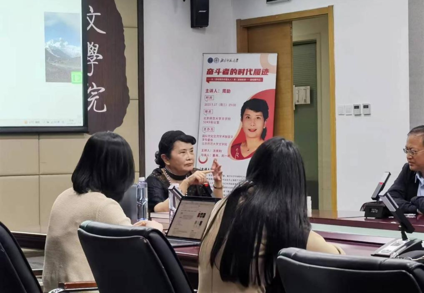 周励的生平分享非常生动、深刻,引起了在场老师、同学们的强烈共鸣和热烈讨论。沈庆利教授对周励分享中展现的强大精神力量进行了精炼概括:拒绝安逸的生活,创造奇迹;大胆尝试,富有冒险精神;敢于吃苦;在实践中学习,善于把握机遇;具备反常规思维;成功是时代与个人奋斗共同作用的结果;个体要努力在改变自身命运的同时为社会做贡献。周励老师既面向广大的世界,又心怀强大的个人意志,她身上所体现出的生命活力、困境中的顽强意志和勇于挑战自我的品格令人无比感动与钦佩,在场同学也应该以周励老师为榜样,不断奋斗、突破自我,为沟通中国与世界文化贡献自己的力量。与谈人姜肖老师、刘一昕老师也对周励老师的作品发表了自己的见解。姜肖老师以历史记忆、文化符号、女性传奇三个关键词为切入点解读《曼哈顿的中国女人》,指出该书呈现出一种现代人的言说、流动和敞开;刘一昕老师从个体生命经验出发讲述自己的阅读体验,阐释《曼哈顿的中国女人》中积淀的审美意识、从《曼哈顿的中国女人》到《亲吻世界》中作者个体位置与生命视野的拓展。在场同学积极提问,周励老师耐心细致地解答,从女性身份与情感记忆、未来的写作计划等方面与师生进一步交流。