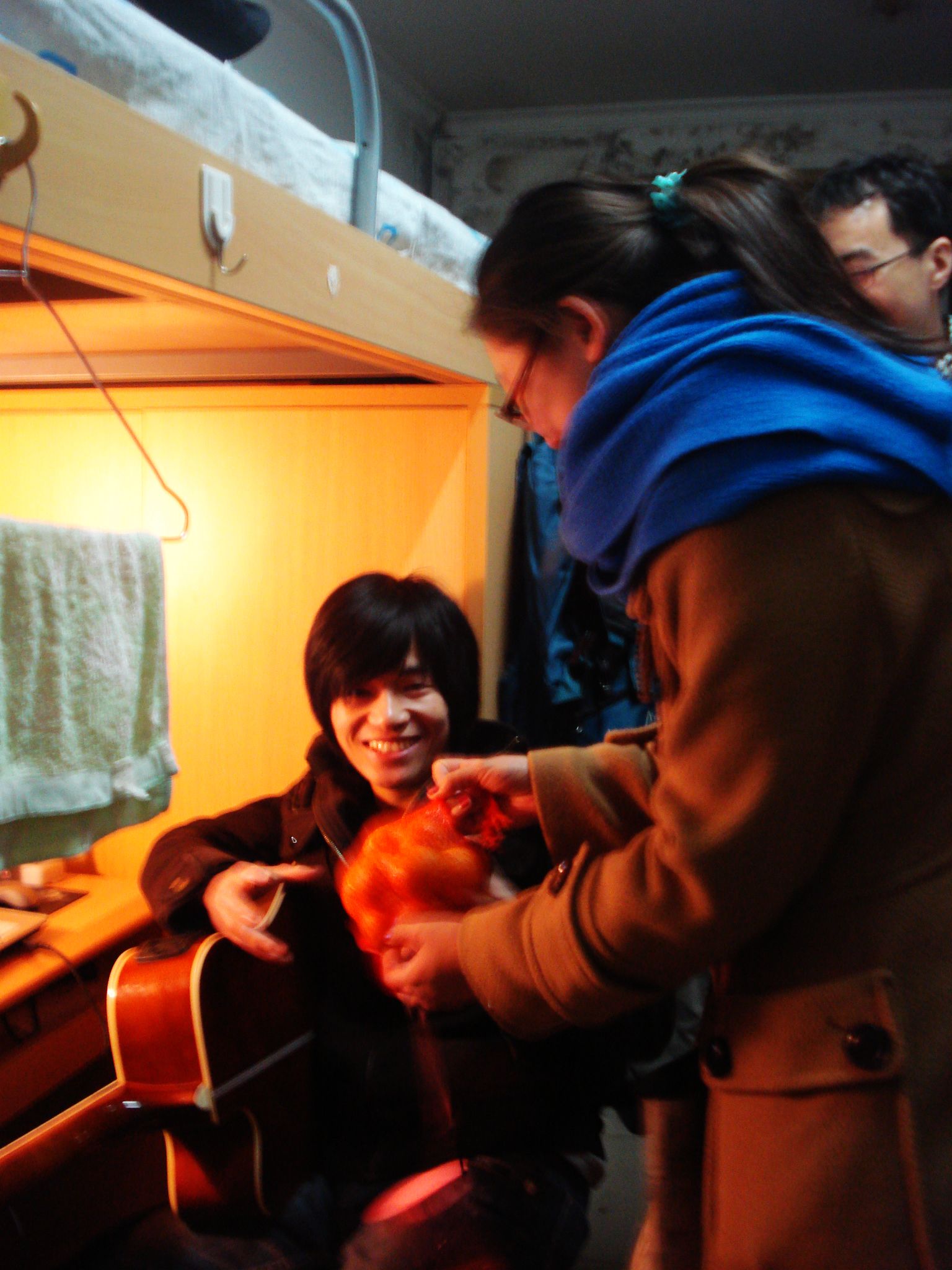 男、女生寝室,仔细询问同学们的学习生活情况,了解到同学们因条件限制所面临的问题,在传达学院关怀的同时,周老师勉励大家以良好心态克服生活中的小困难,处理好生活与学习的关系。此外,周老师对即将毕业的2009级教育硕士提出的毕业生签约、户口迁移等问题,耐心而有针对性地进行了解答。走访中,研会为每一间寝室送上了精心准备的新年礼品,周老师还即兴表演了“吉他秀”,博得大家一阵喝彩。