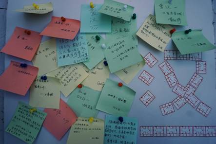 在十一时许,班级中安排的第一波同学到了,同已经在此完成准备工作的一部分班委开始了一个下午的奋战。每当有一名同学来到,就在这块白班上留下自己对班级的一句祝愿,还有自己的姓名。