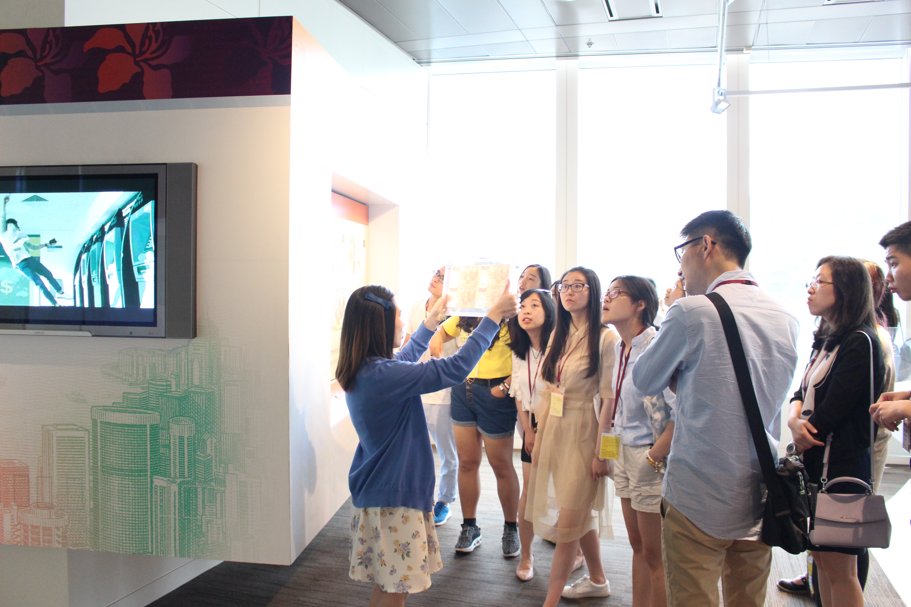 下午两点半,同学们来到了位于中环国际金融中心二期的香港金融管理局参观。这里的工作人员向大家介绍了香港金融管理局的历史和职能、港币的发行与流通。金管局是香港特别行政区政府财政司辖下的独立部门,负责香港的金融政策及银行、货币管理,担当类似中央银行的角色,直接向财政司司长负责。金管局是香港政府架构中负责维持货币及银行体系稳定的机构,其主要职能为:在联系汇率制度的架构内维持货币稳定;促进金融体系,包括银行体系的稳定与健全;协助巩固香港的国际金融中心地位,包括维持与发展香港的金融基建管理外汇基金。工作人员向大家介绍到,港币大多是在金管局监管下由汇丰银行、渣打银行、中国银行三家银行发行,工作人员还向同学们介绍了港币的不同版本以及流通情况。
