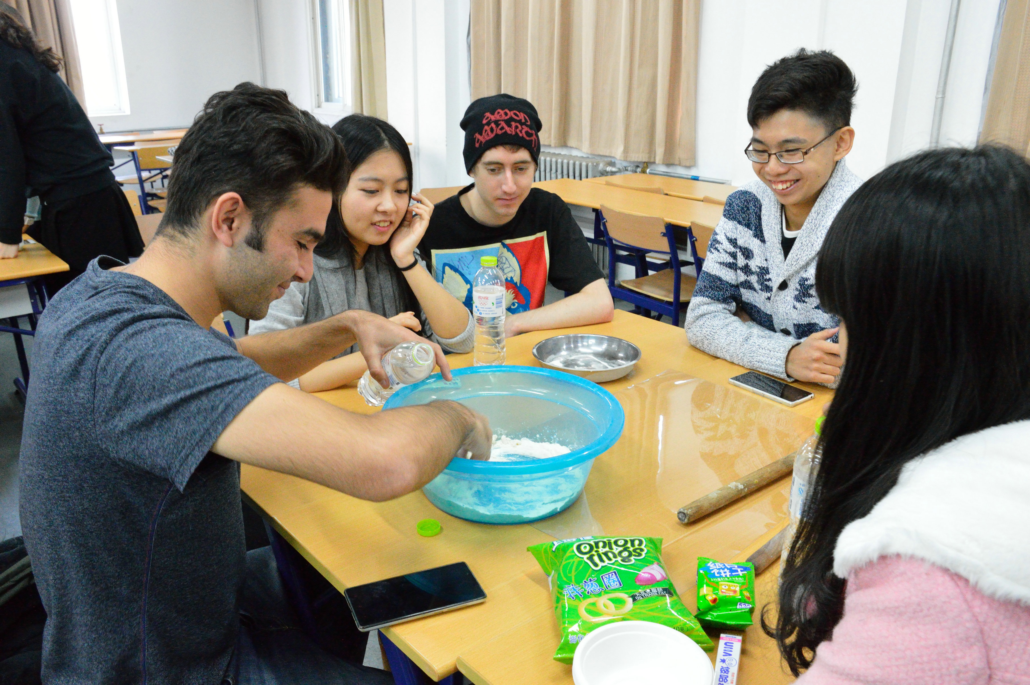 在实践与游戏环节中,学生们亲身体验制面过程,使用擀面杖、砧板等工具动手和面,并发挥自己的创意制作出形状各异的面条。在“开心切切乐”的游戏中,中外学生通过小组合作堆起一座座面粉山,在相互配合中积极交流,拉近了彼此的距离。此外,学生们还品尝了各地经典面类美食,加深了对中华传统面文化与世界其他国家面食文化的认识与理解。