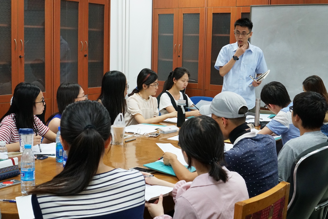 7月3日-4日为在校培训阶段。曹老师为大家介绍了国际音标的使用规范、语音学的基础知识和方言调查的基本方法,向大家说明了调查大纲的编写原则和《方言调查字表》的使用事宜,并邀请了方梦洁同学担任发音人,进行了一次模拟记音。短短两天的培训使同学们掌握了基础理论知识,演练了调查方法,熟悉了调查流程。