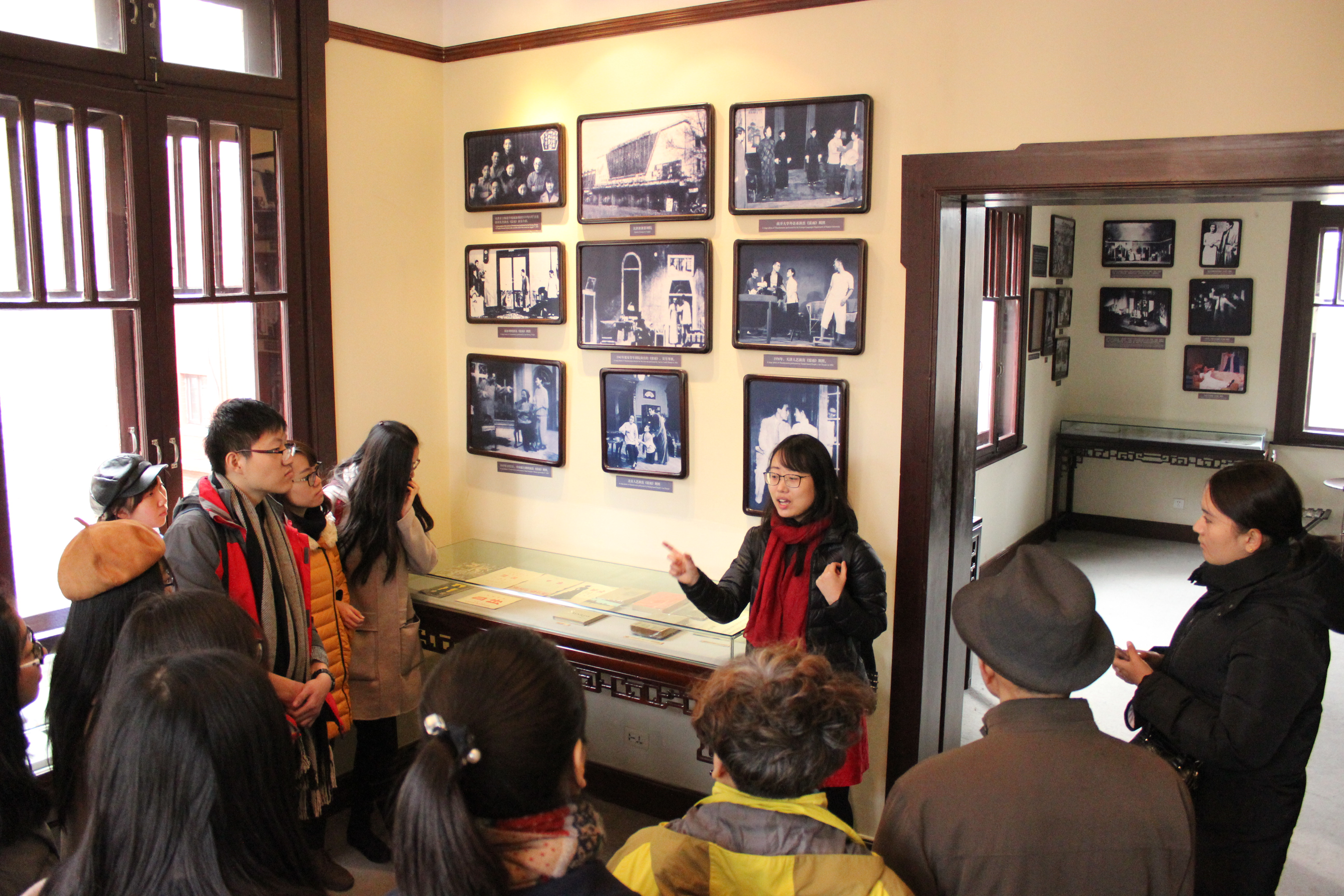 离开梁启超故居我们去往参观曹禺故居,故居建于1910年,前后两座二层意式风格建筑。在曹禺故居中,研究生会的学生骨干们带领我们一起参观。在故居的陈列展品中,我们发现了曹禺与戏剧的不解之缘。曹禺继母酷爱看剧,从小便带着曹禺去看戏,曹禺早早地就接触了大量的话剧。在求学过程中,曹禺曾扮演女角罗拉,又考入清华大学英文系,大四时创造话剧《雷雨》,声名鹊起。抗战时期的曹禺创作了不同于原先剧场艺术的《蜕变》话剧,展现出黑暗的世界经过共产党的努力变为光明的世界的历史过程,具有鼓舞性和英雄主义的赞美性。建国之后,曹禺于1978年创造出了最后一部作品《王昭君》,将历史上的昭君出塞改编成了勇于自我选择的喜剧。在参观讲解过程中,研会团体中专门研究曹禺的徐圣洁同学,其对于曹禺戏剧如数家珍,对于曹禺创作的发展过程夹叙夹议,为同学们带来了异彩纷呈的讲解,还引发了其他参观者的跟随聆听。
