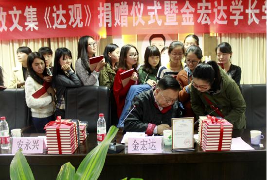 捐赠了其写作的散文集《达观》500册。