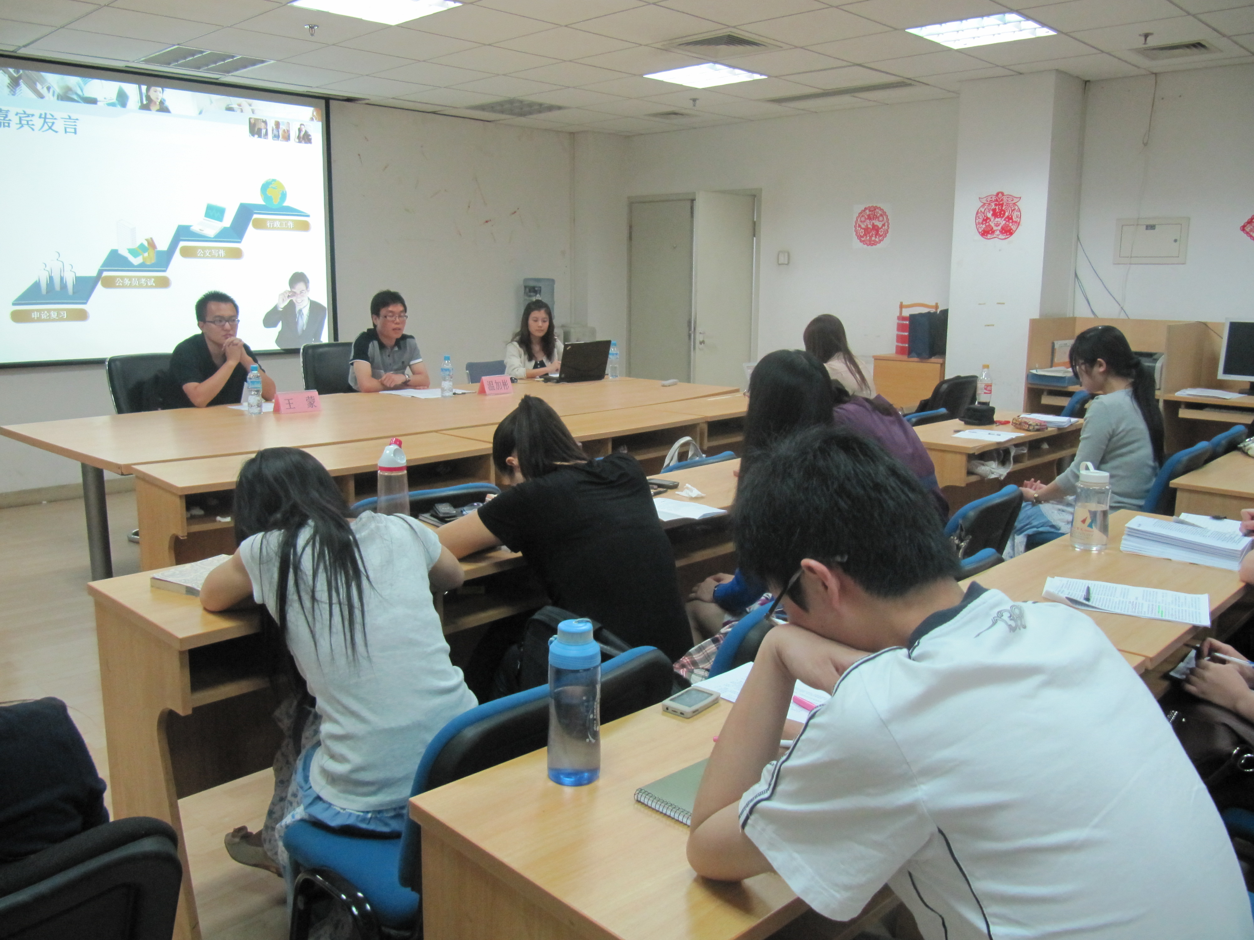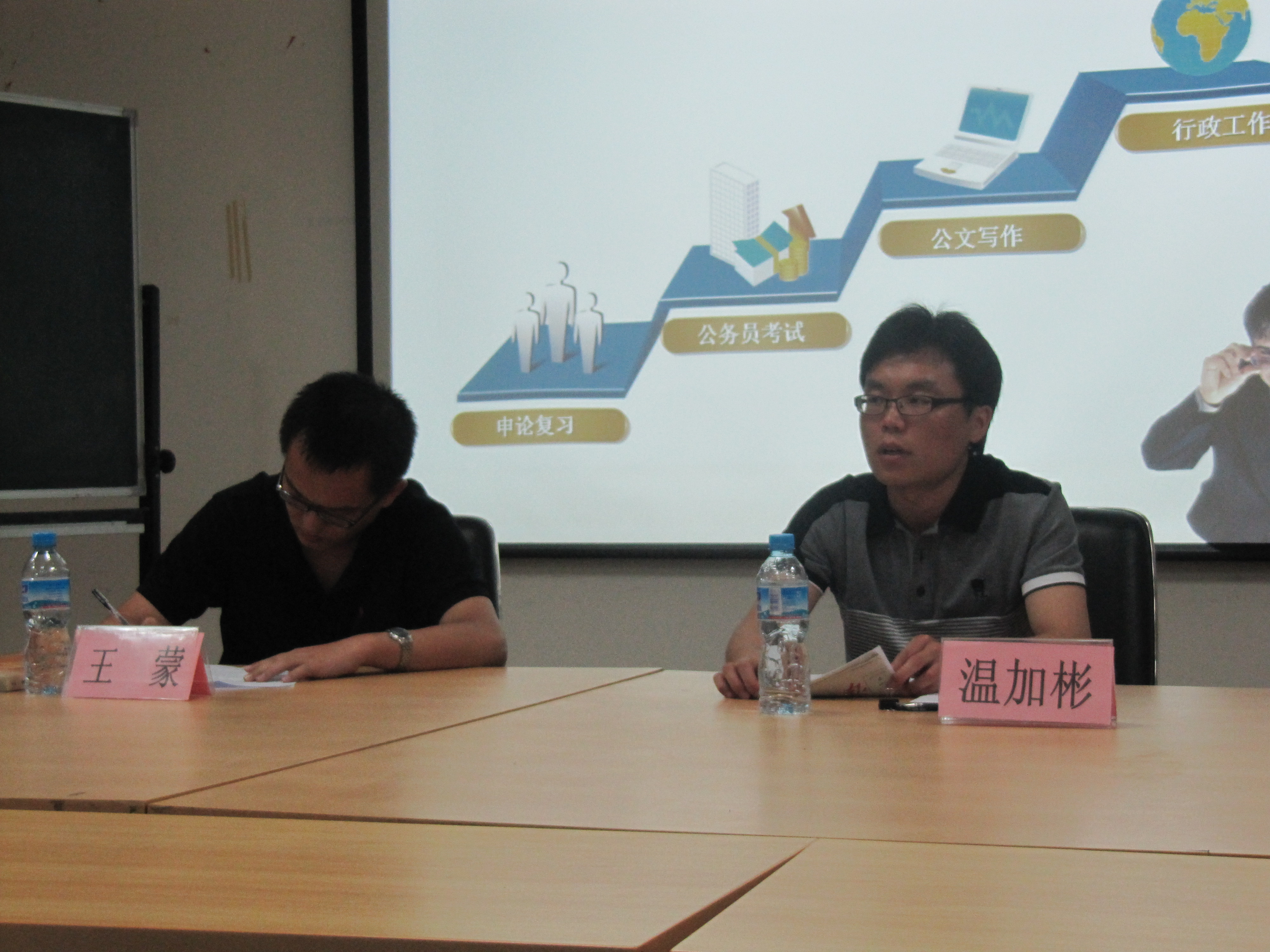 研究生会实践部与09级研究生就业行政组在主楼A707举办了一场公文写作指导活动,主题为“与申论的第一次亲密接触”,邀请到校友温加彬和王蒙为主讲嘉宾。