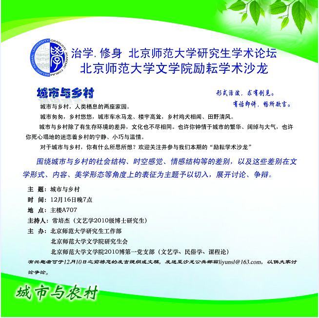 活动的性质是沙龙,亦即不求长篇大论,逻辑严明,但求形式活泼,有所激发,使大家都能参与进来,有话说。大家可从乡村与城市的社会结构、时空感觉、情感结构等的差别,以及这些差别在文学形式、内容、美学形态等之上的表征为主题切入,展开讨论、争辩。可以旁逸斜出,切勿游谈无根;可以据理以争,不可语含讥讽;不求四平八稳,但求有所创见。