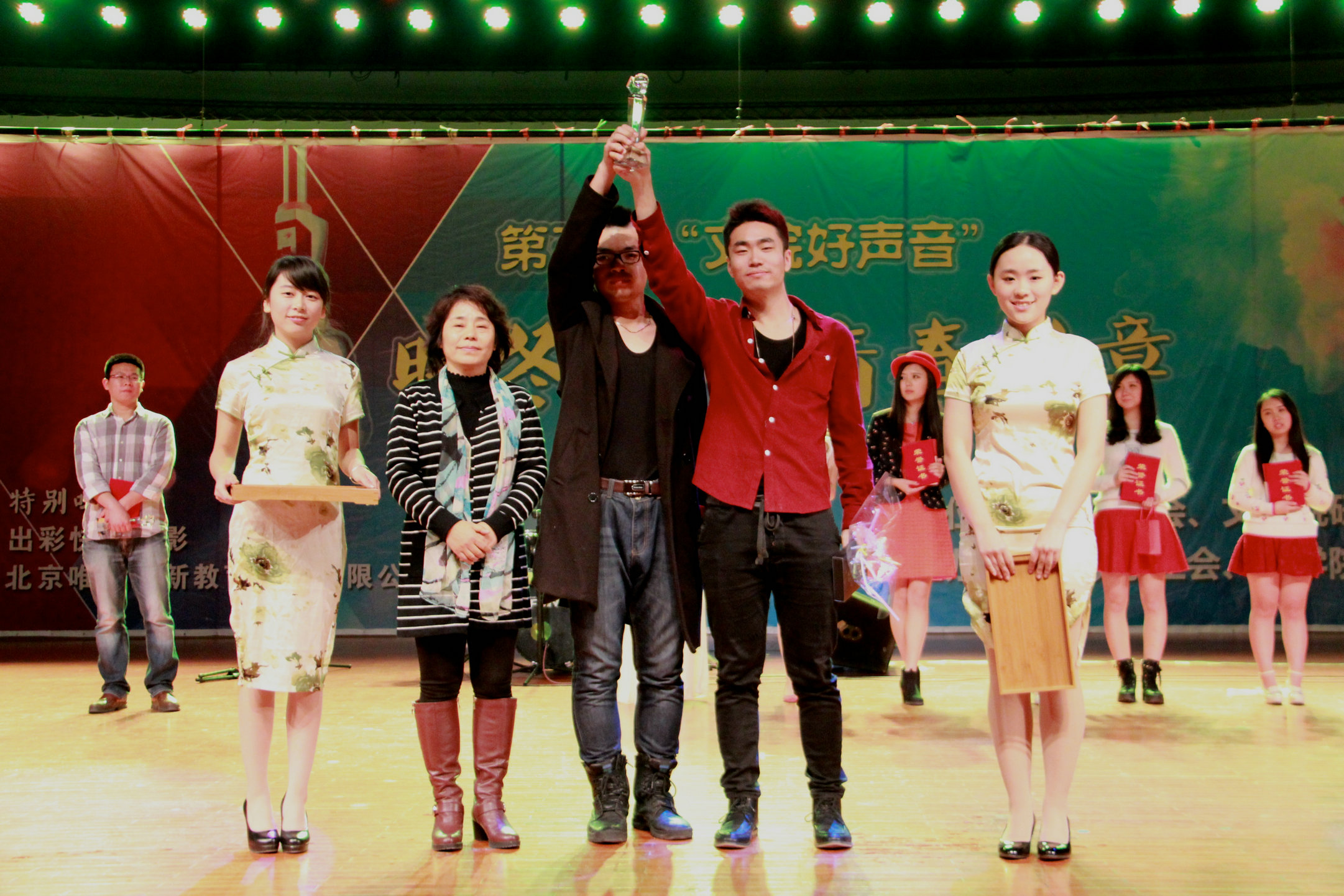 组合对唱环节同样异彩纷呈,来自不同年级的选手联袂演唱,完美配合,或轻松幽默,或悠远动情,更有7号、9号选手强强联合的《因为爱情》,为现场观众带来一场听觉盛宴。比赛中采用的专业评委与大众综合多因素打分的评分形式保证了结果的公平性,也使现场观众体会到与选手的互动。最终,在经过选手独唱,组合对唱,大众评审,微信投票等环节激烈比拼后,由本科生常宇峰,邢楷组成的9号 “新生活运动”组合夺得桂冠,而7号选手王濛和10号选手张华分别夺得亚季军,最佳人气奖则花落2号本科生选手陈唯莹和4号研究生选手侯润婕。在意犹未尽的咏叹中,北师大91毛巾哥