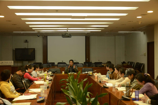 的学生与来自北京大学、中国政法大学、首都师范大学、北京城市学院的同学以及读经会的成员进行了读经活动的体验与交流,互相了解对方学校读经开展情况,气氛十分活跃。在交流过程中,一位头发花白,面色和善的老人尤为引人注意。原来,这位老人是中华诗词吟诵协会的胡天青老师。他听闻“在谦论语读书会”在北师大举行,便赶来参加此次活动,宣传古诗词吟诵。