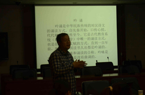下午一点半到两点半短短一个小时的时间,胡天青老师给大家讲授了诗词吟诵的基本理论及吟诵技巧。并且充满热情地现场表演了《春晓》、《登鹳雀楼》等大家耳熟能详的诗词吟诵。在座的所有的人被胡老师的热情所感染,纷纷唱和。中场休息过后,赵伯毅老师做了主题为“学懂语言”的演讲,解答了同学们“为什么要素读经典”、“西方辩证哲学和儒家经典的区别”的疑惑。这场演讲使同学们受益匪浅。