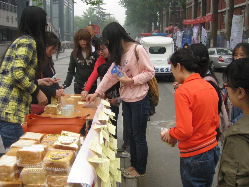 此次活动以世界读书日为契机,内容是同学将读过的一本好书之读书心得写在读书小卡上与大家分享,就能在活动现场换取一份面包。活动刚开始就陆续有同学询问活动事宜,之后更是积极书写读书小卡,将自己的读书体验展示在分享墙上,场面一度火爆。不少同学更是当场打电话通知其同学好友前来现场参加。不到一个小时时间,活动准备的100个面包就全部送出,分享墙上更是贴满了同学各种类型书籍的分享心得:有专业书籍《乡土中国》,有武侠书籍《笑傲江湖》,有文学巨作《红楼梦》,还有畅销书《从北京到台湾 那么远那么近》……尽管到最后面包已经送完,仍有不少同学主动填写读书小卡,与同学分享自己的读书体验。