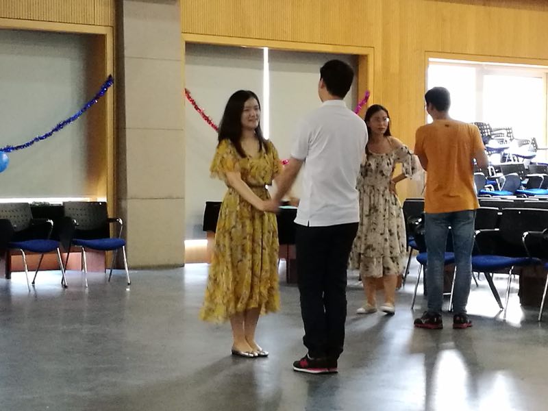 于师姐:这次舞会很有趣,或许由于之前有过两次培训,一部分同学可以完成基本舞步。由于更多同学没有交谊舞的基础,舞会还贴心地安排了教学环节。在舞蹈老师耐心的指导之下,在场的同学都能够完成简单的舞步,现场一度较为热闹。软件所的一位男生还倾情弹唱了赵雷的《19岁时候的歌》,引起全场阵阵掌声。自由跳舞环节,很多同学的舞步更加熟练,心态更加放得开,在肢体的摇摆中也能获得更多轻松的感觉。舞会的最后,主办方还进行了抽奖环节,奖品是一个u盘,很符合软件所的气质。跳舞令人放松,使人心情愉悦,很高兴在毕业之际能参加这样一场舞会。